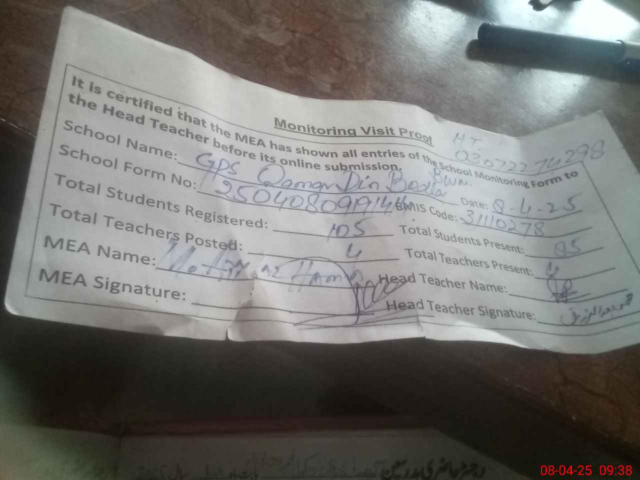 | Monitoring Date: 08-04-2025 | Start Time: 08-04-2025 09:19 AM | End Time: 08-04-2025 09:42 AM | Name of MEA: M.**** HA**** BN**** | |