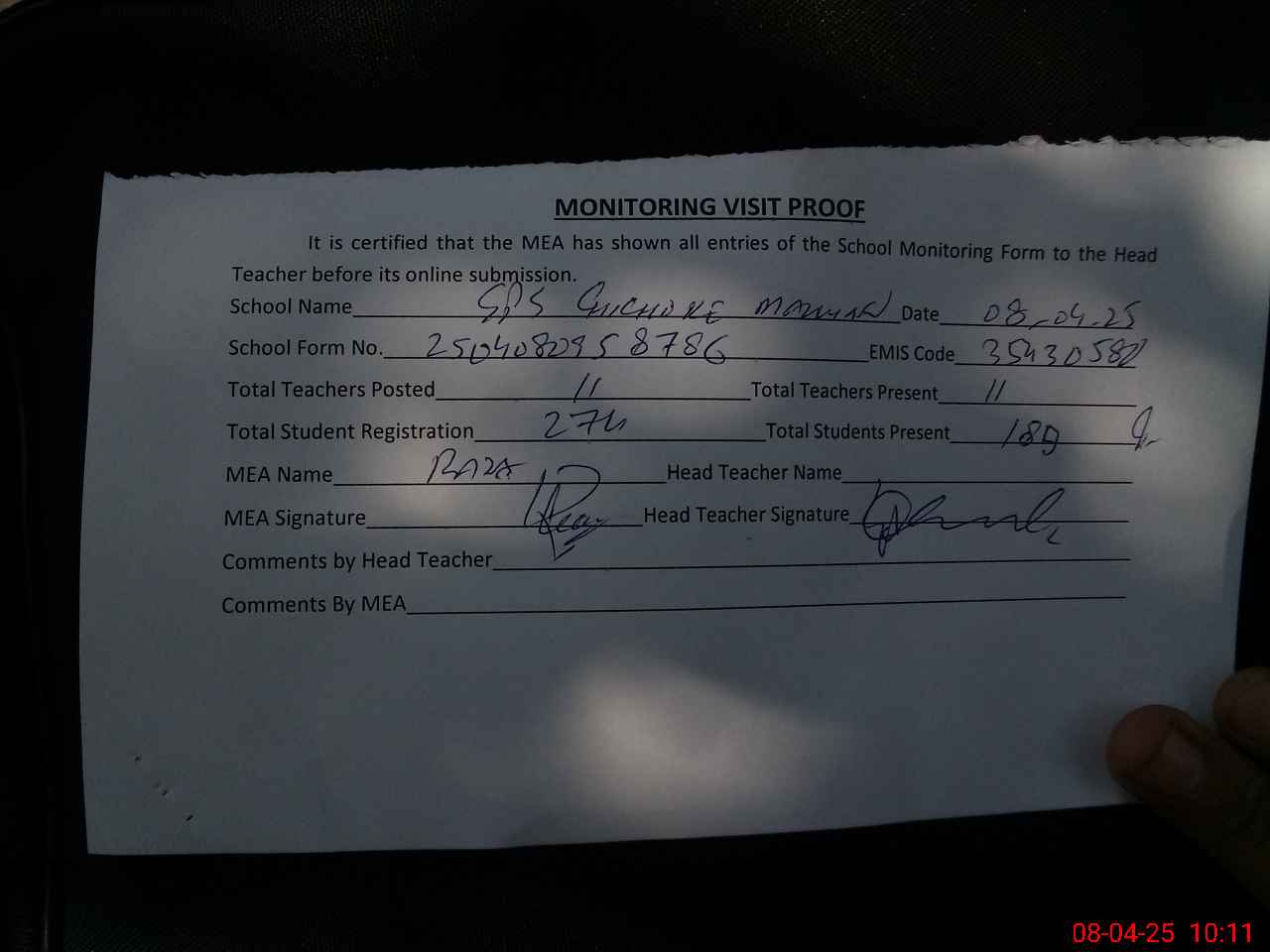 | Attendance Register | Head Teacher | MEA with School | Visit Proof |
