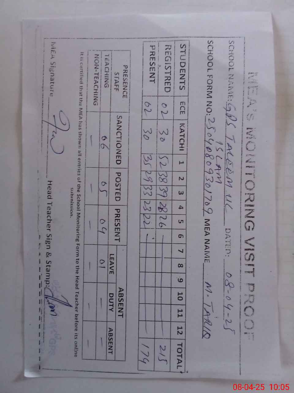 | Attendance Register | Head Teacher | MEA with School | Visit Proof |