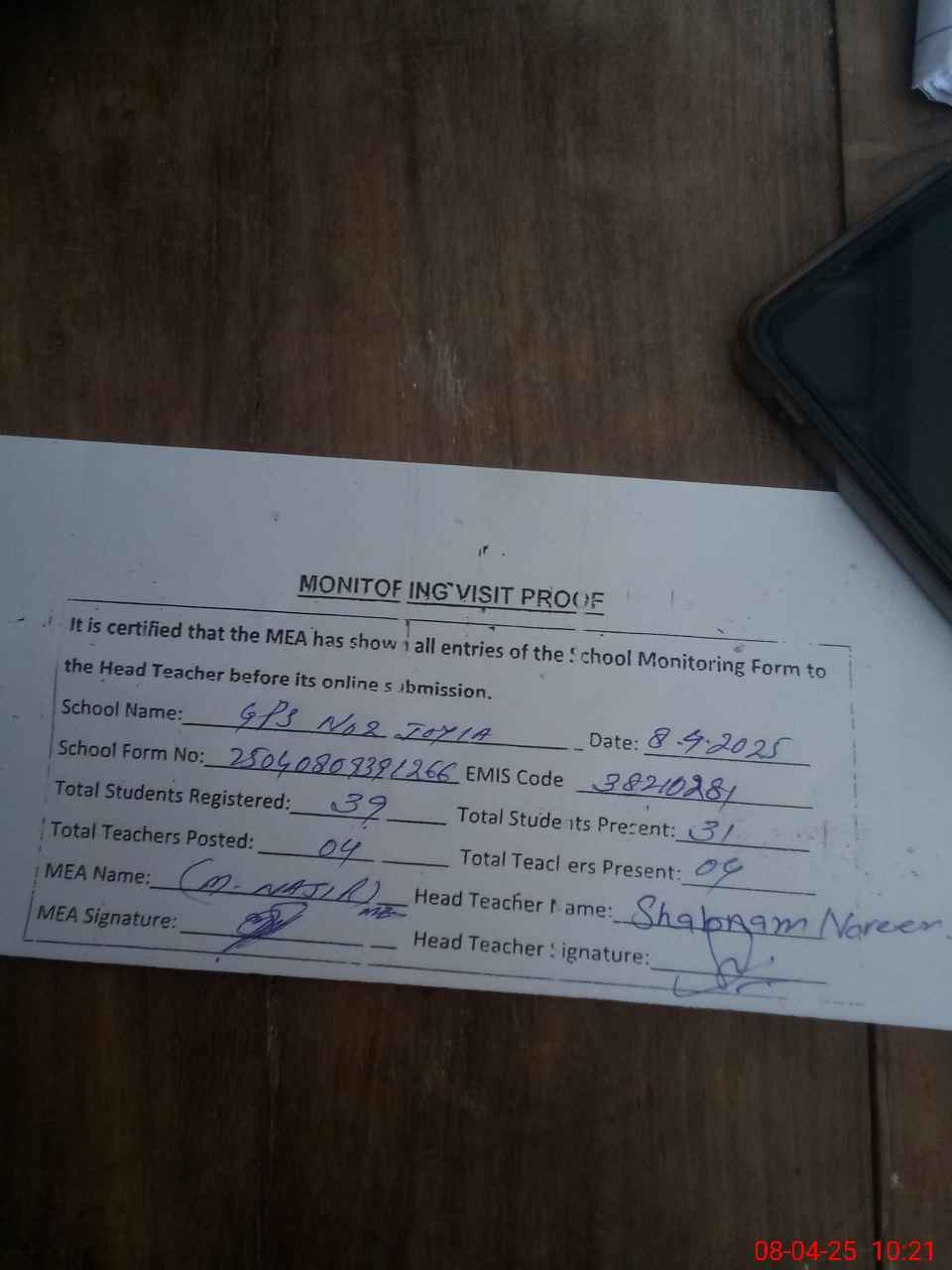 | Attendance Register | Head Teacher | MEA with School | Visit Proof |