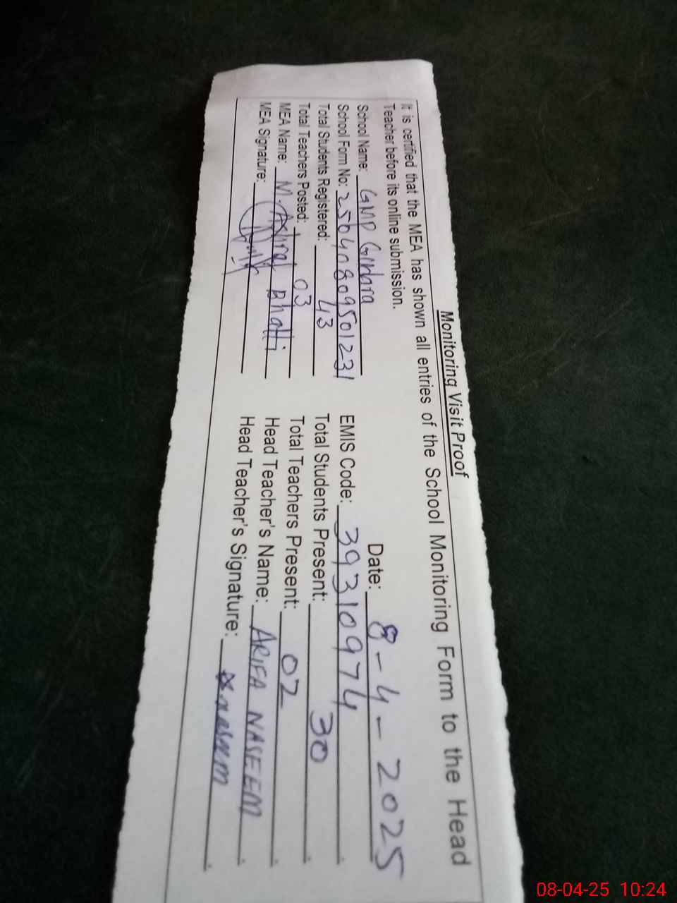| Attendance Register | Head Teacher | MEA with School | Visit Proof |