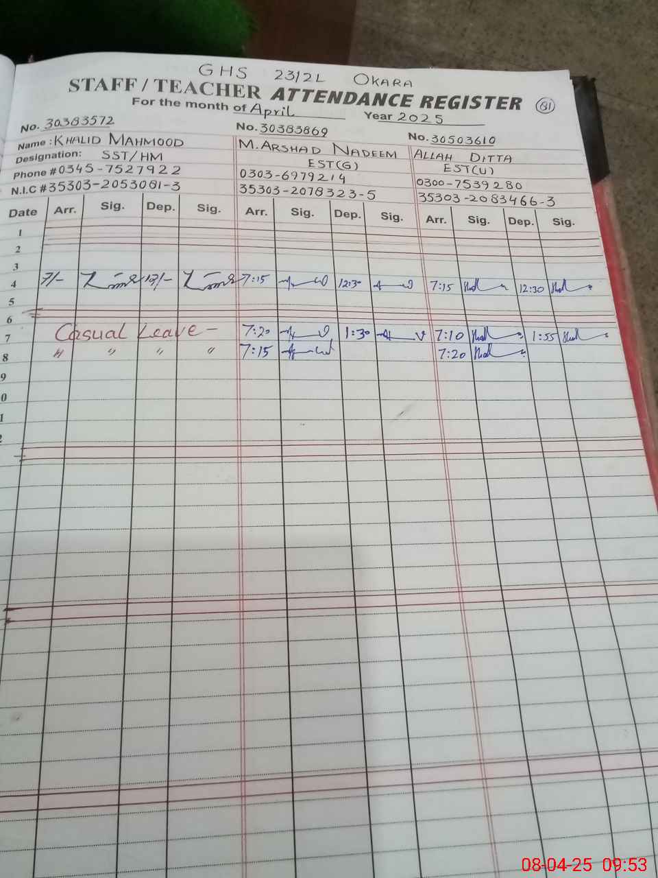 | CNIC | Full Name | Designation | R/C | Absence during last cal. month |