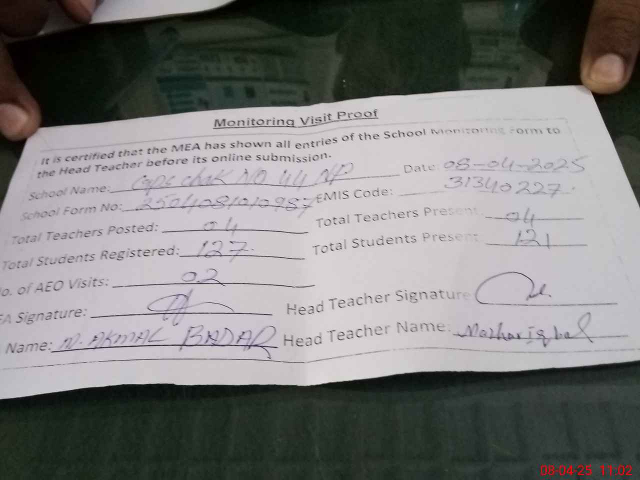 | EMIS Code: 31340227 | Name of School: GPS CHAK NO. 44 NP | |||