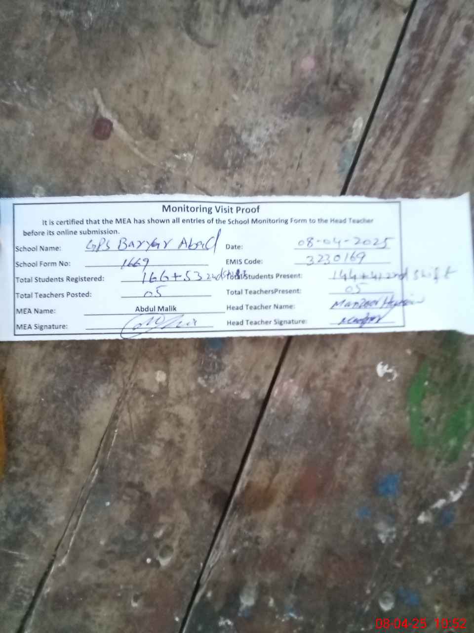 | Attendance Register | Head Teacher | MEA with School | Visit Proof |