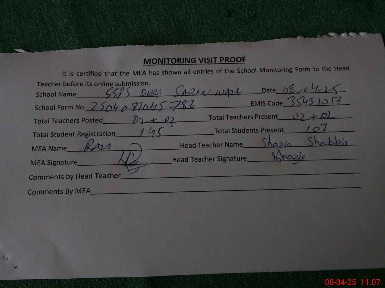 | Attendance Register | Head Teacher | MEA with School | Visit Proof |