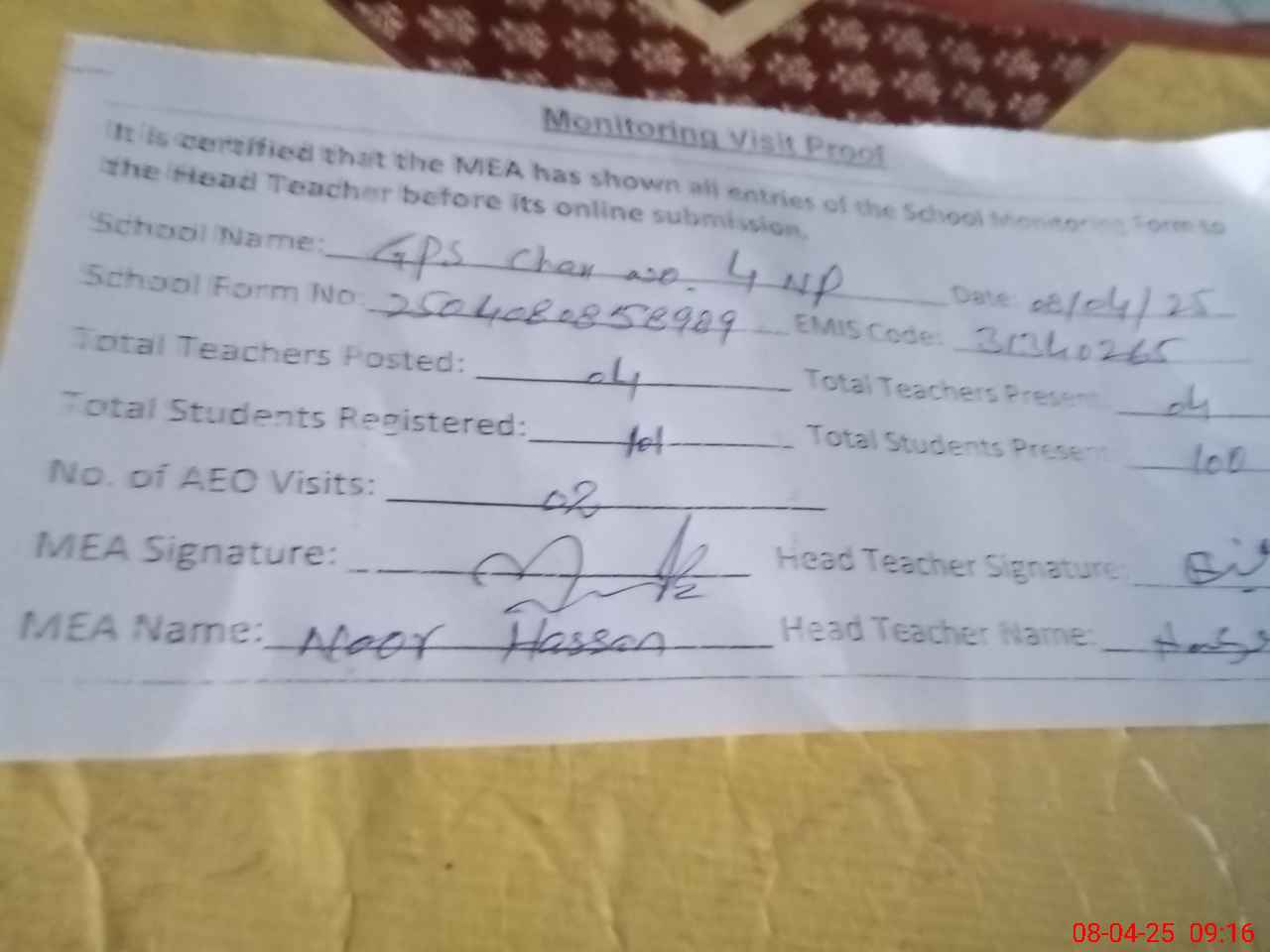 | EMIS Code: 31340265 | Name of School: GPS CHAK NO. 4/NP | |||
