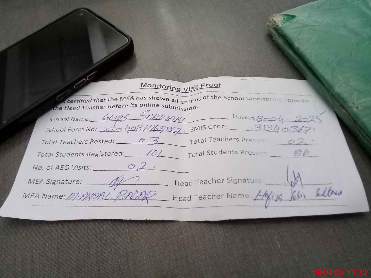| EMIS Code: 31340367 | Name of School: GGPS SARWAHI | |||