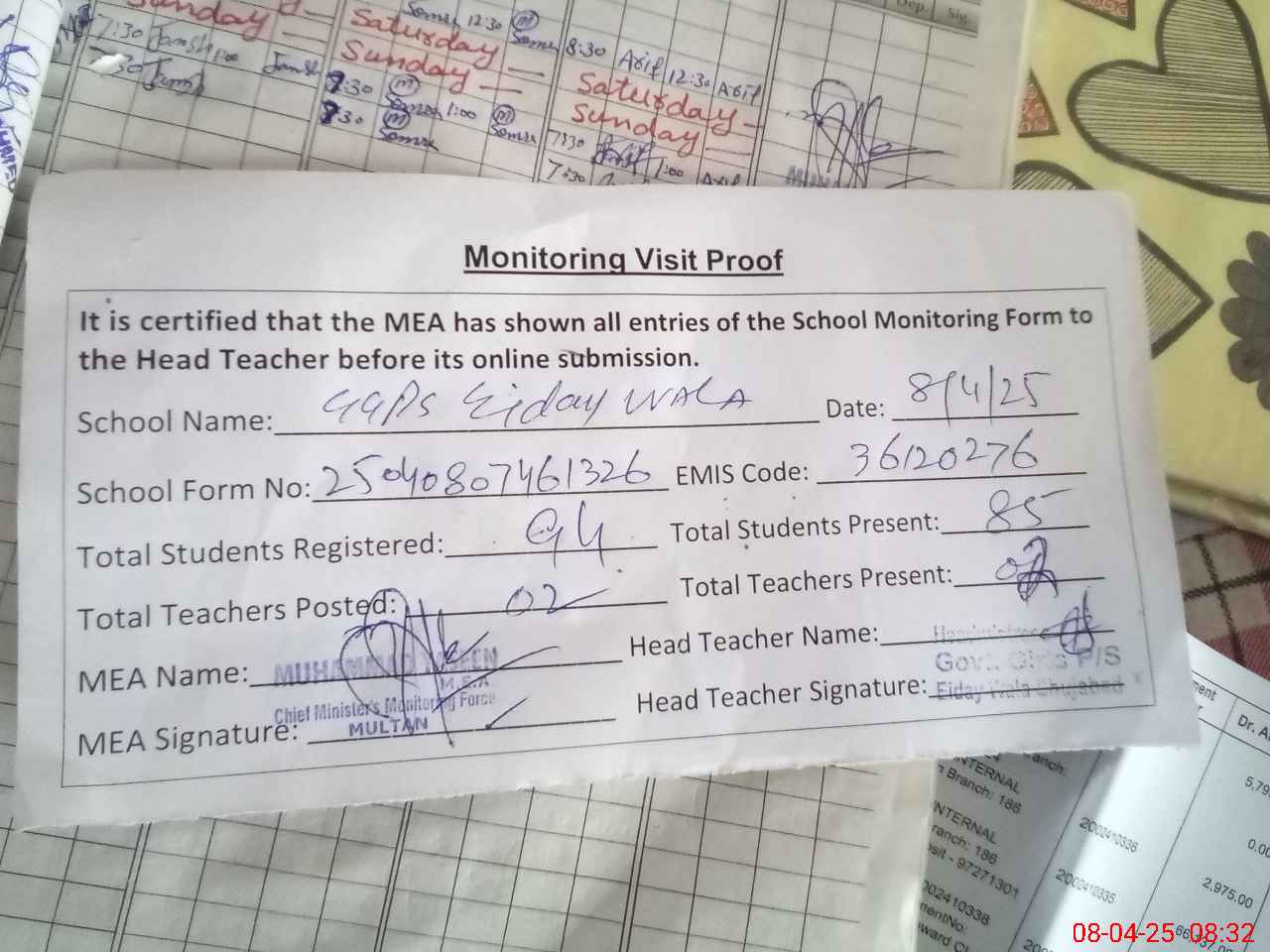 | Attendance Register | Head Teacher | MEA with School | Visit Proof |