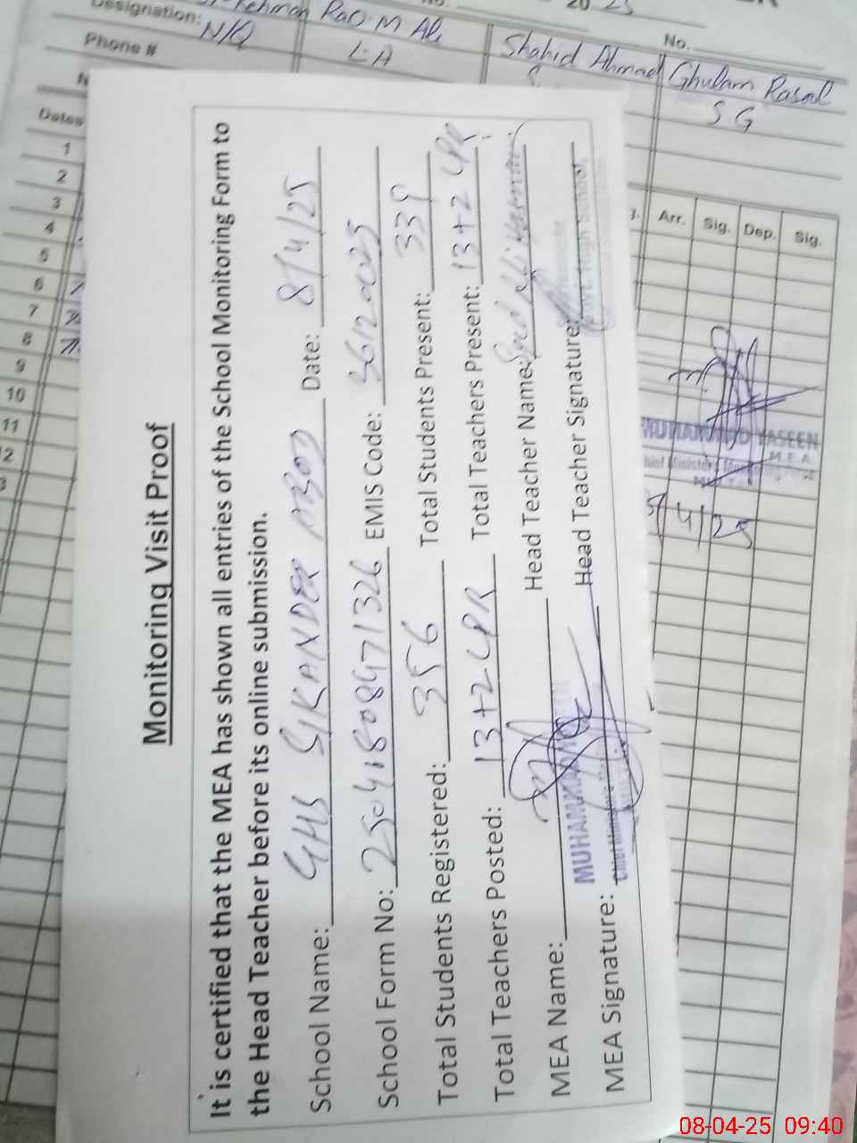 | Attendance Register | Head Teacher | MEA with School | Visit Proof |