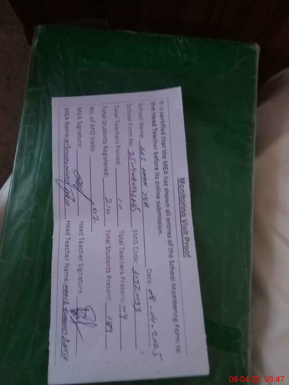 | Attendance Register | Head Teacher | MEA with School | Visit Proof |