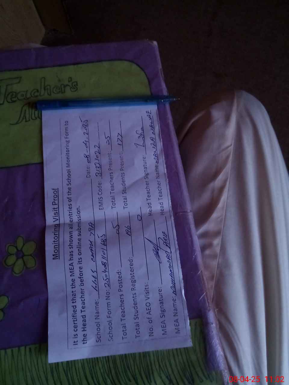 | Attendance Register | Head Teacher | MEA with School | Visit Proof |
