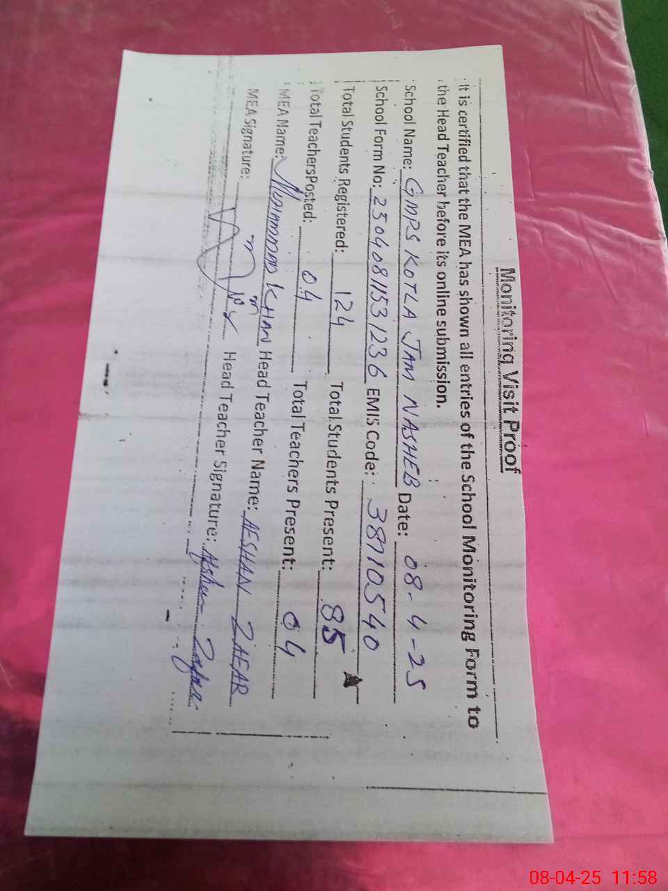 | Attendance Register | Head Teacher | MEA with School | Visit Proof |
