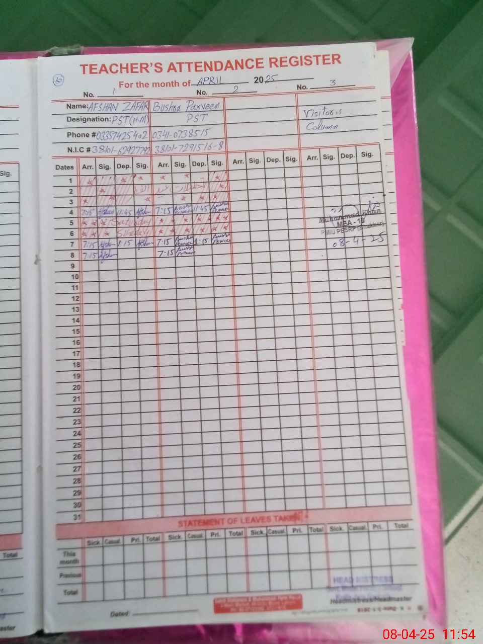 | Name: Af**** Za**** Designation: (School Headmaster's/Headmistress's) PST Phone/Cell Number: 03**** |