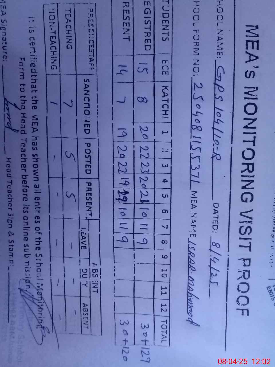 | Attendance Register | Head Teacher | MEA with School | Visit Proof |