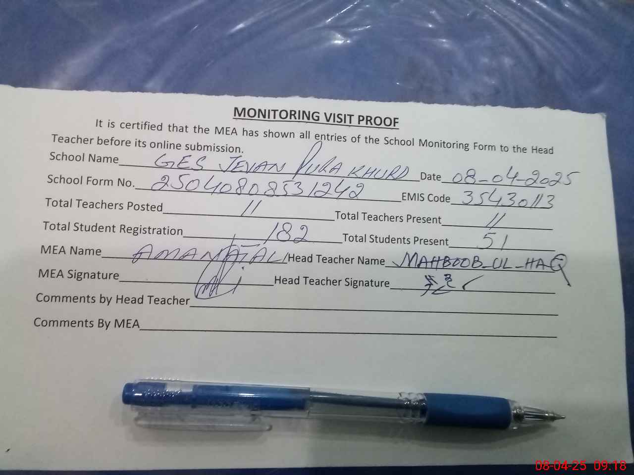 | Attendance Register | Head Teacher | MEA with School | Visit Proof |