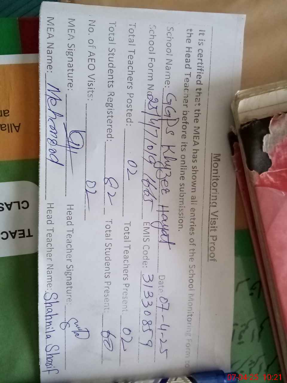 | Attendance Register | Head Teacher | MEA with School | Visit Proof |