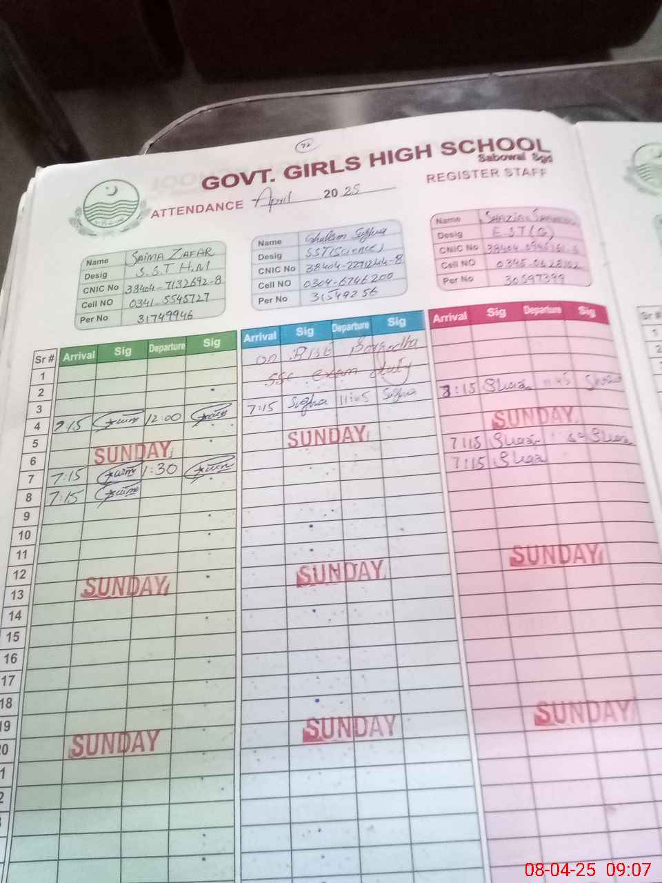 | CNIC | Full Name | Designation | R/C | Absence During Last Calender Month |