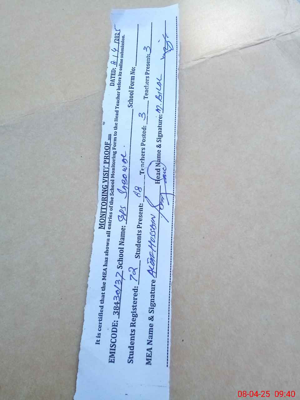 | Attendance Register | Head Teacher | MEA with School | Visit Proof |