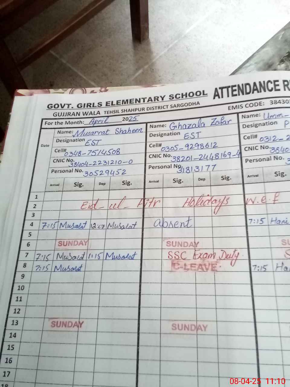 | Name: NU**** FA**** Designation: (School Headmaster's/Headmistress's) SST (SCIENCE) Phone/Cell Number: 03**** |