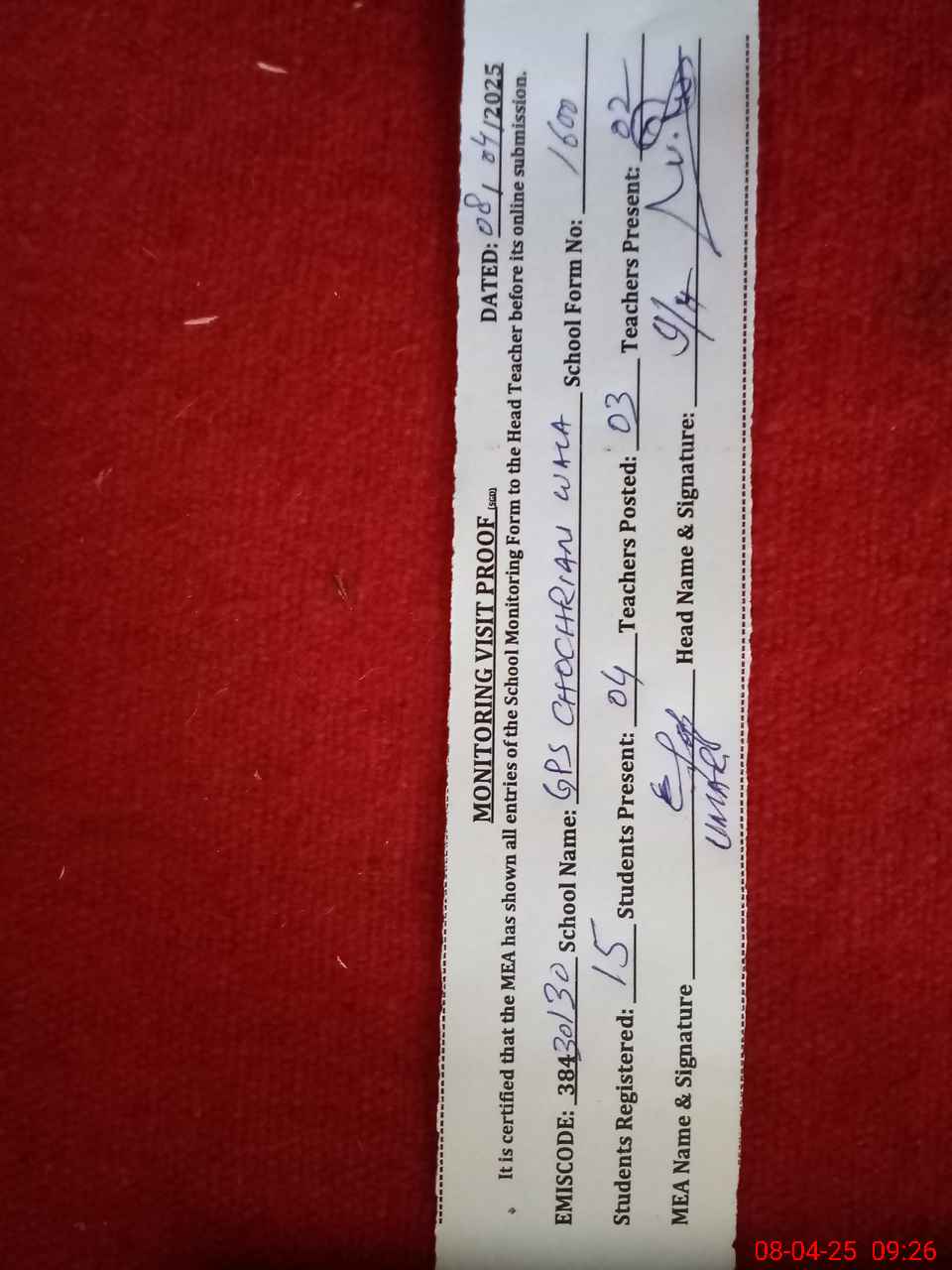 | EMIS Code: 38430130 | Name of School: GPS CHOCHRIAN WALA | |||