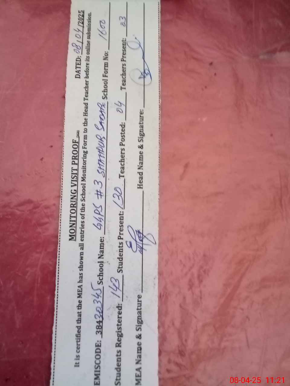 | Attendance Register | Head Teacher | MEA with School | Visit Proof |