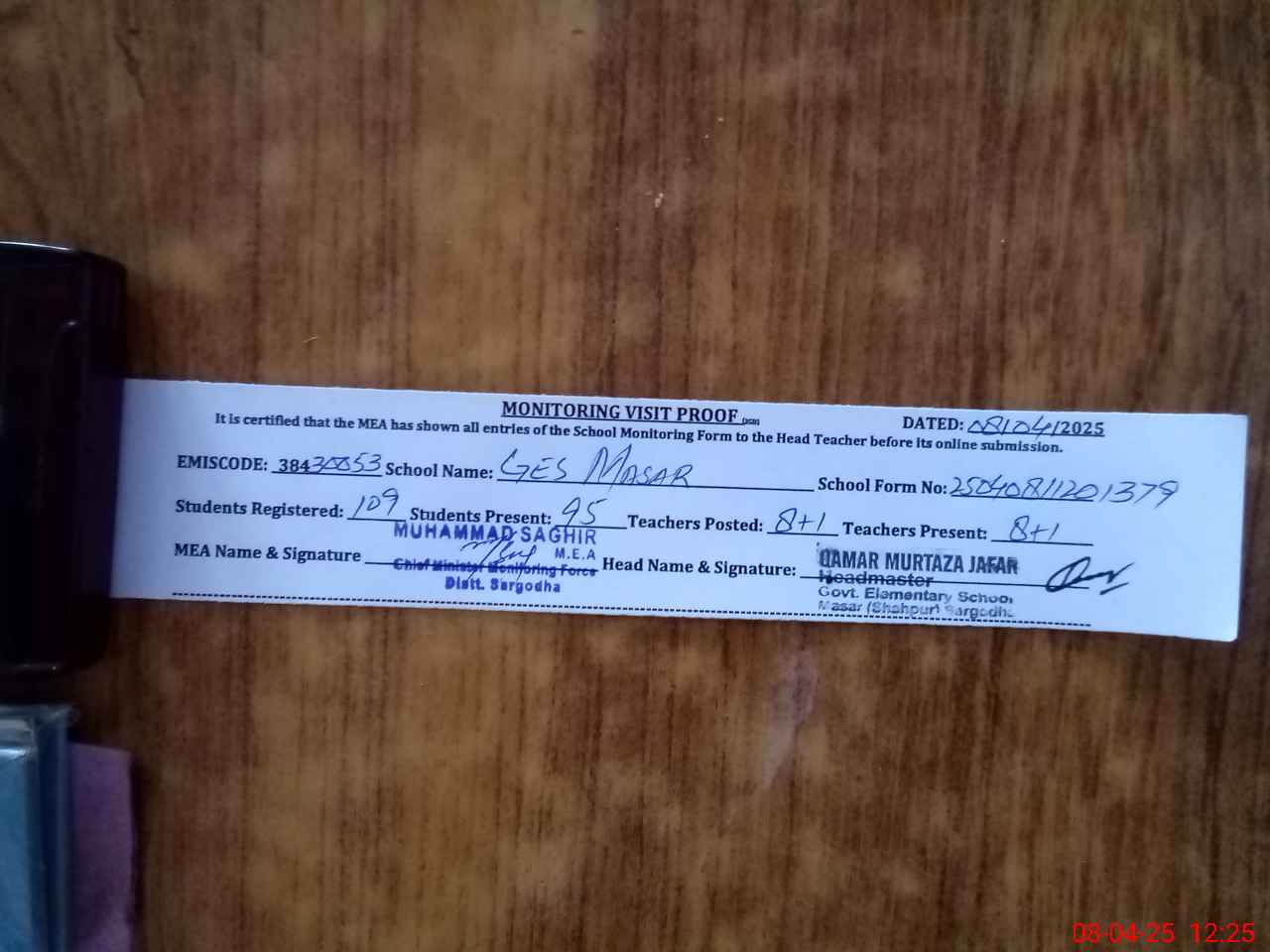 | Attendance Register | Head Teacher | MEA with School | Visit Proof |