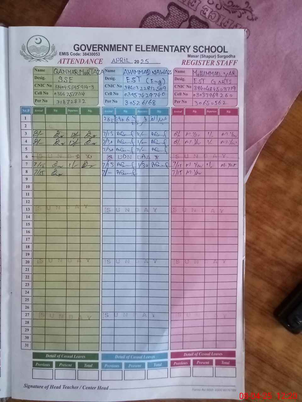 | CNIC | Full Name | Designation | R/C | Absence During Last Calender Month |