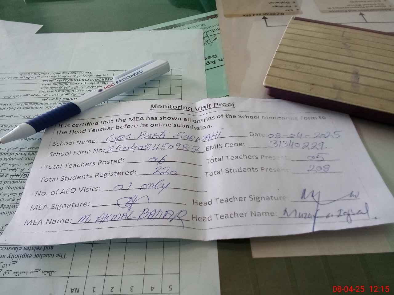 | Monitoring Date: 08-04-2025 | Start Time: 08-04-2025 11:50 AM | End Time: 08-04-2025 12:37 PM | Name of MEA: Mu**** Ak**** Ba**** | |