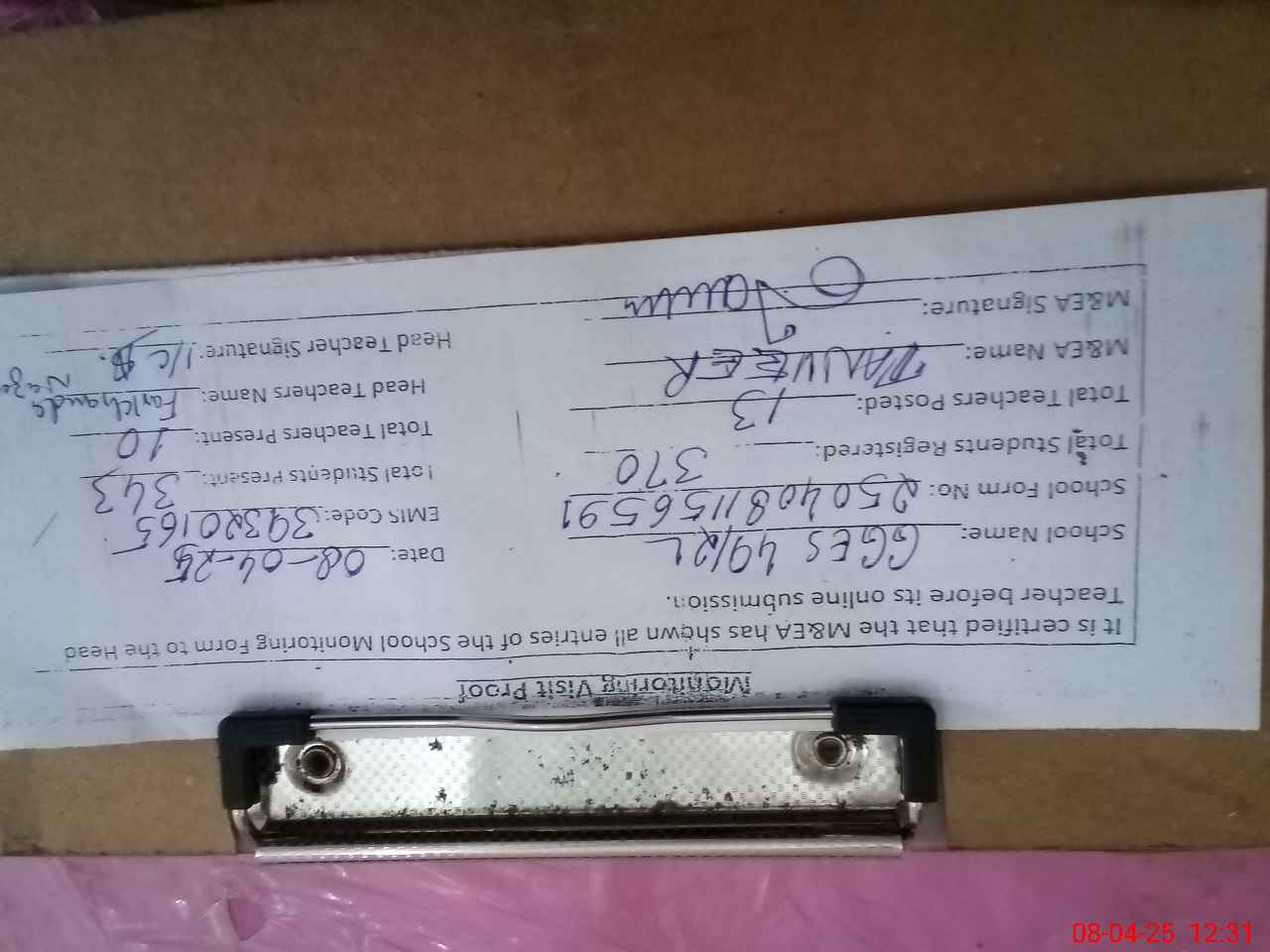 | Attendance Register | Head Teacher | MEA with School | Visit Proof |