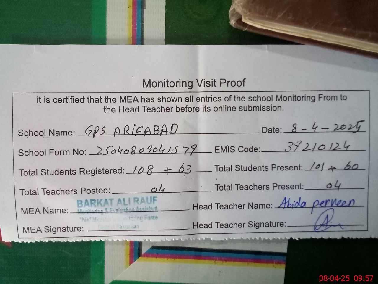 | Attendance Register | Head Teacher | MEA with School | Visit Proof |