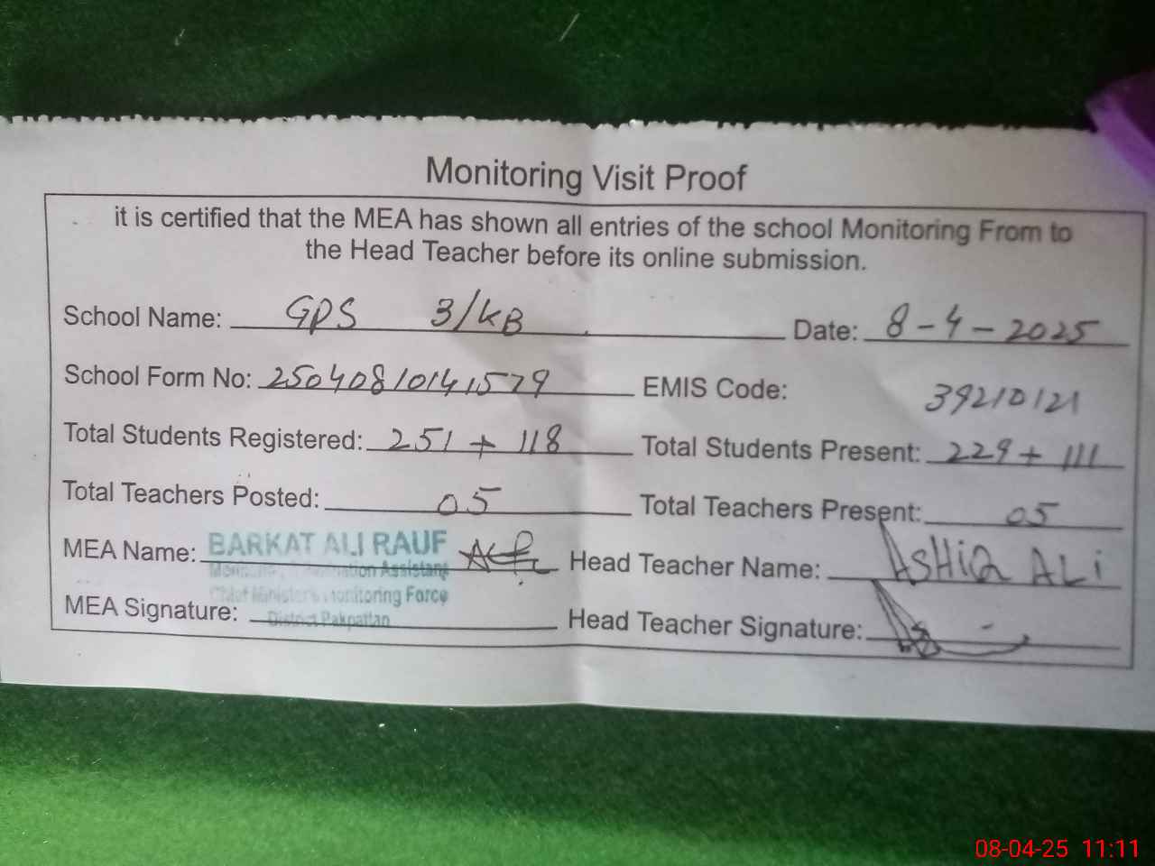 | Attendance Register | Head Teacher | MEA with School | Visit Proof |