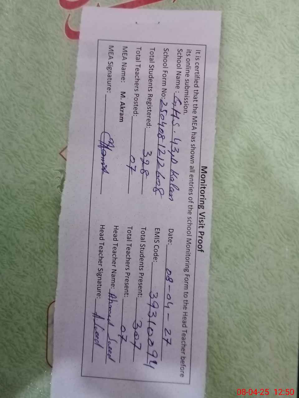 | Attendance Register | Head Teacher | MEA with School | Visit Proof |