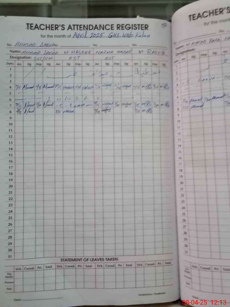 | CNIC | Full Name | Designation | R/C | Absence During Last Calender Month |