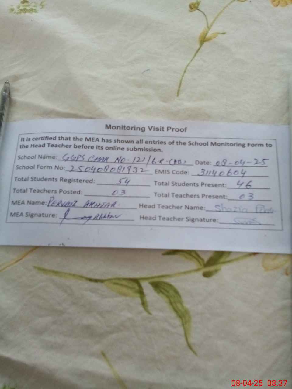 | Attendance Register | Head Teacher | MEA with School | Visit Proof |