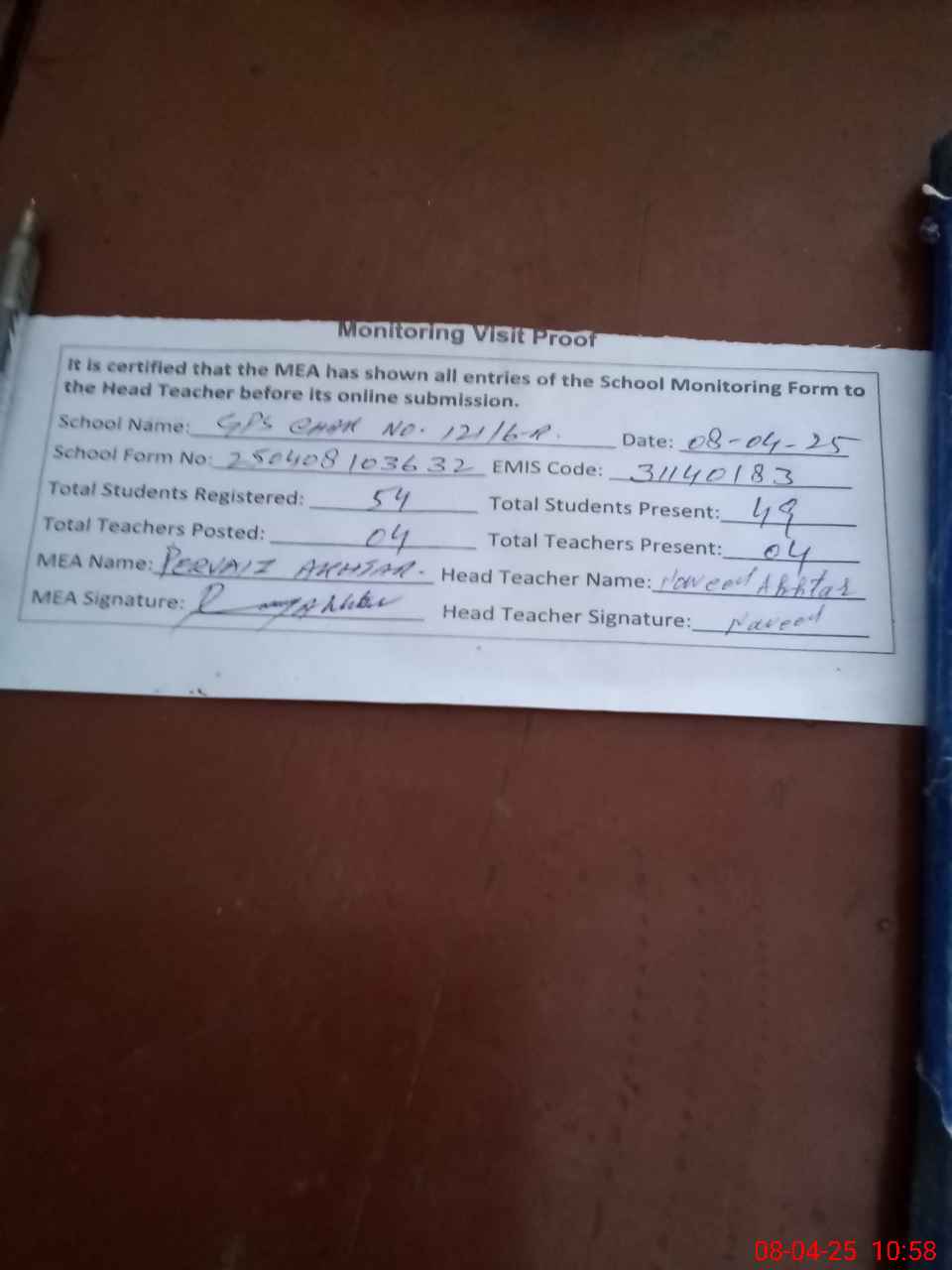 | Attendance Register | Head Teacher | MEA with School | Visit Proof |