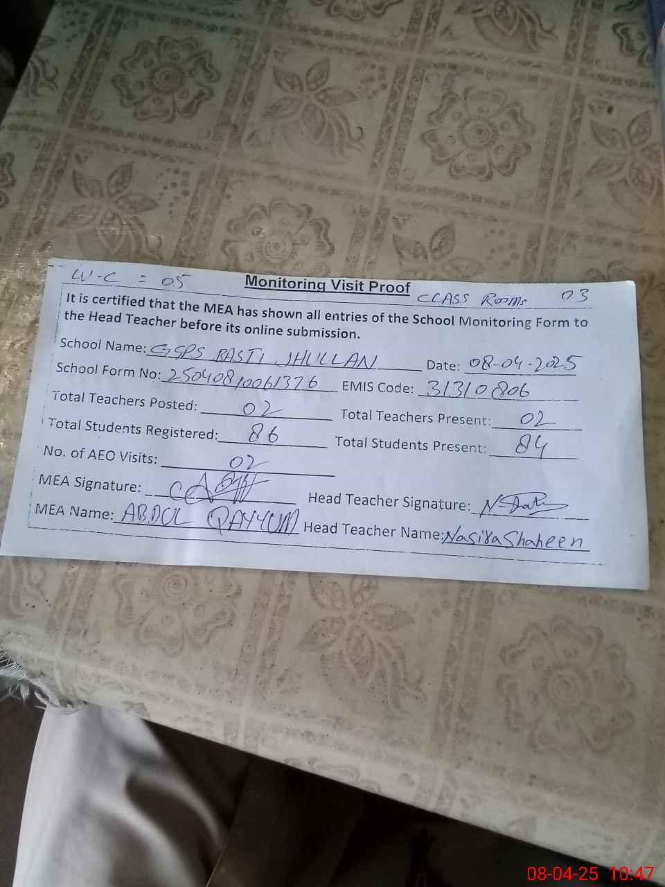 | Attendance Register | Head Teacher | MEA with School | Visit Proof |