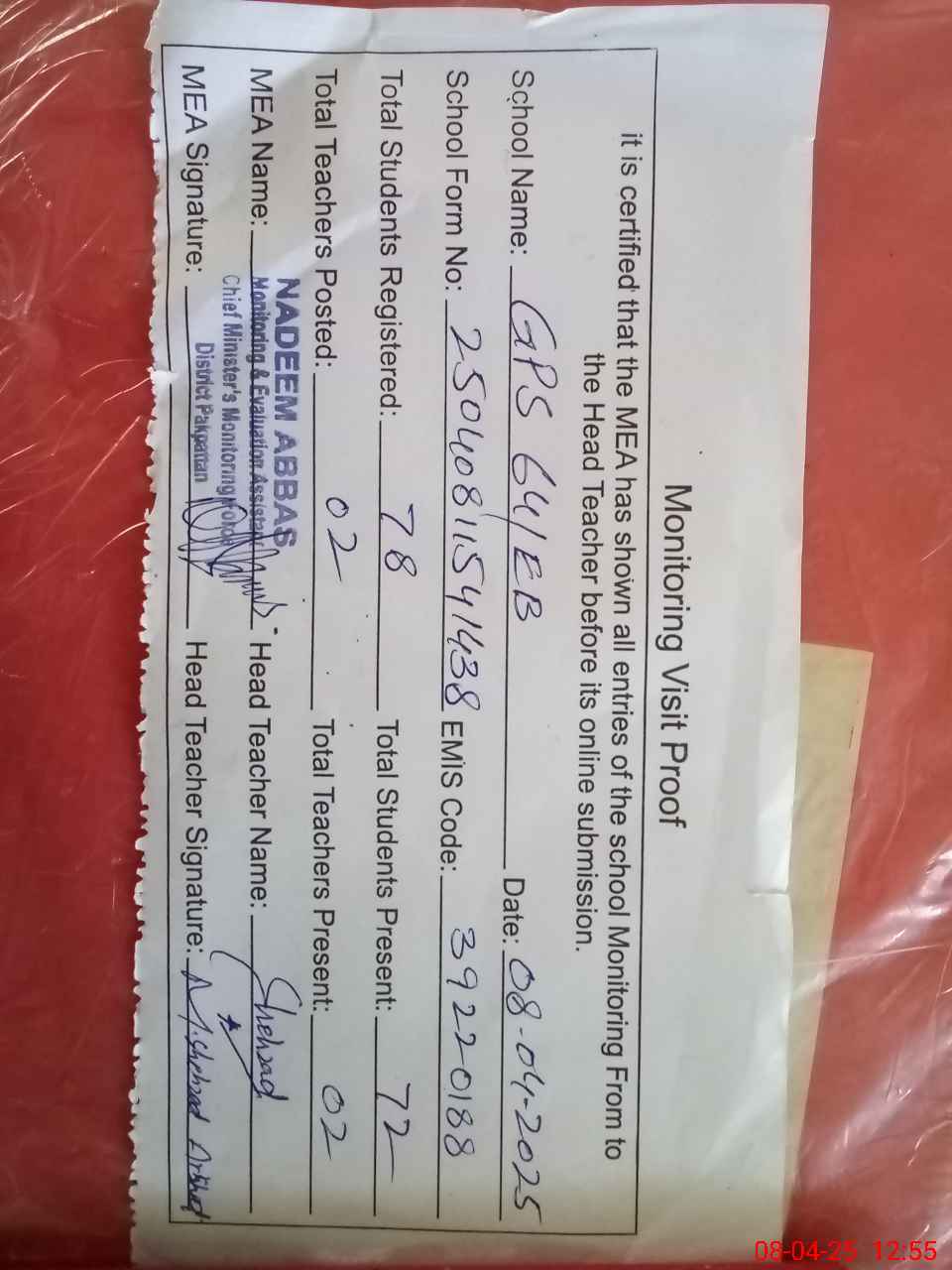 | Attendance Register | Head Teacher | MEA with School | Visit Proof |