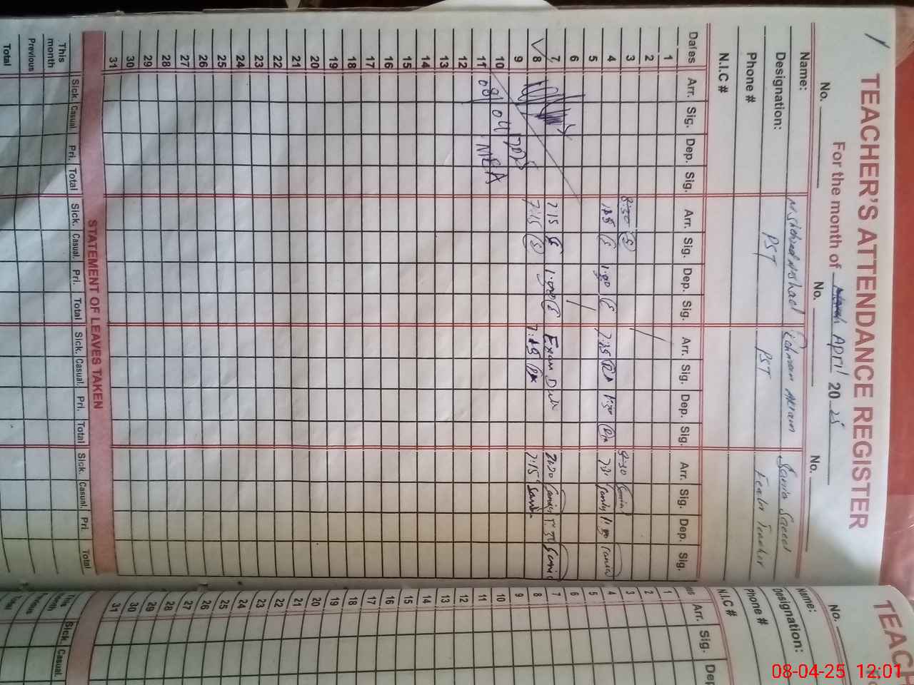 | CNIC | Full Name | Designation | R/C | Absence During Last Calender Month |
