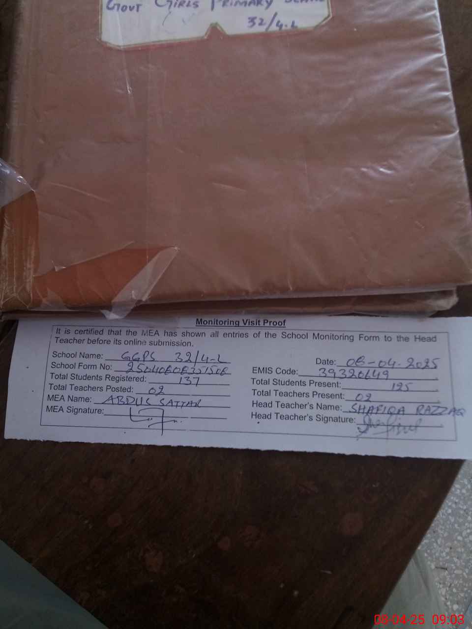 | Attendance Register | Head Teacher | MEA with School | Visit Proof |