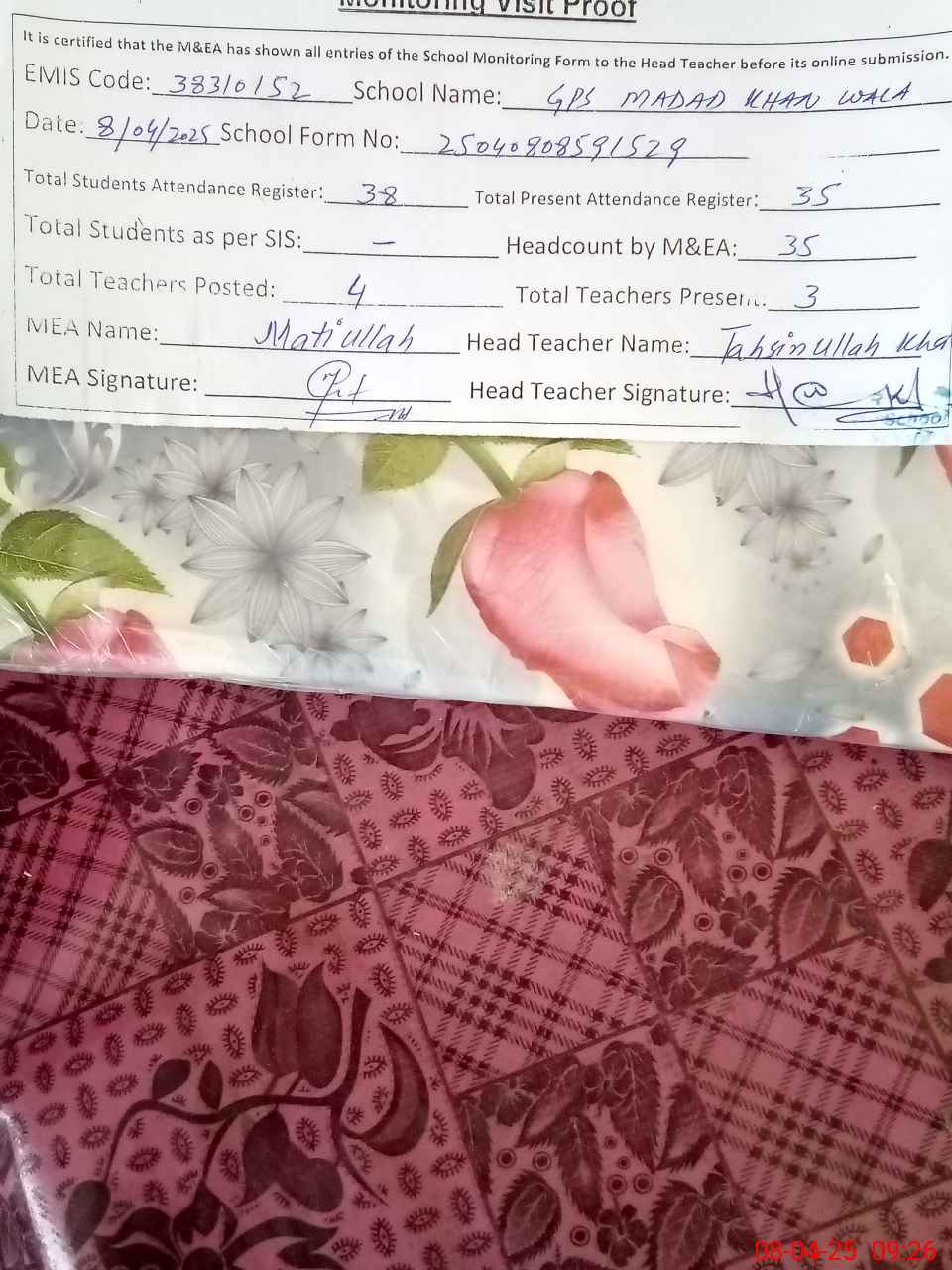 | Attendance Register | Head Teacher | MEA with School | Visit Proof |