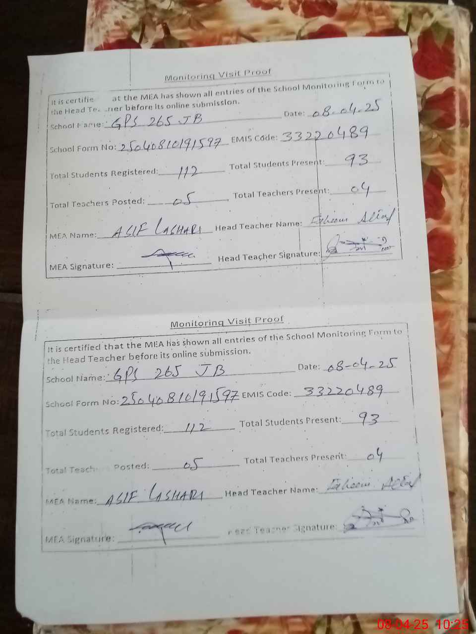 | Attendance Register | Head Teacher | MEA with School | Visit Proof |