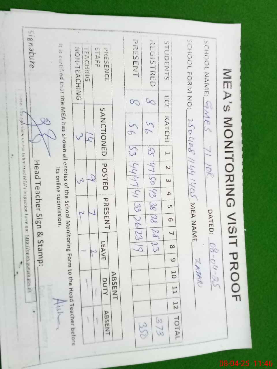 | Certified that this School was Inspected by the Undersigned MEA/DMO Today and the Information Stated Above is as Per Record. | |||||
