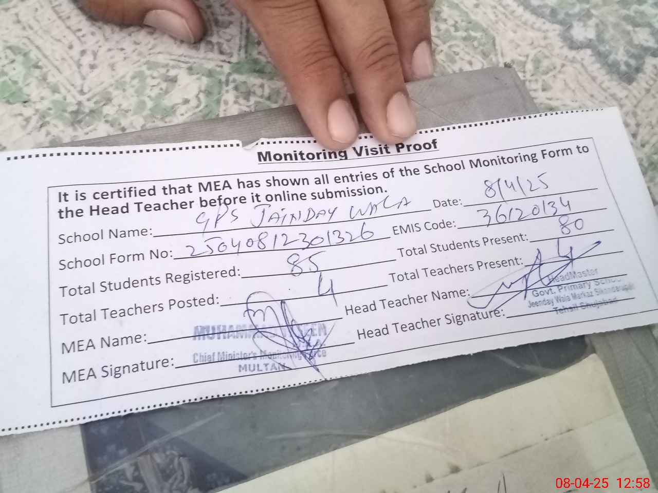 | Attendance Register | Head Teacher | MEA with School | Visit Proof |