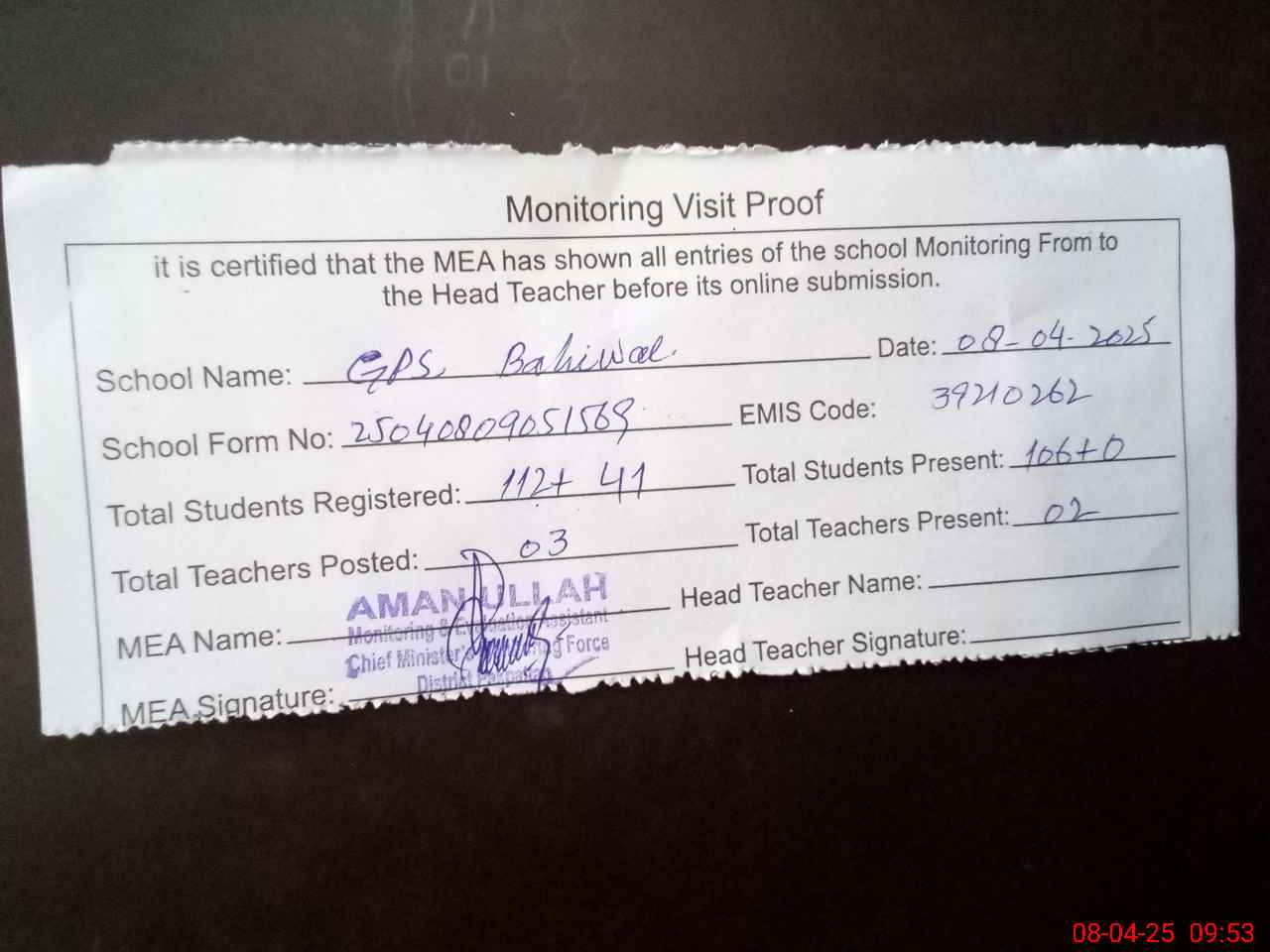 | EMIS Code: 39210262 | Name of School: GPS BAHIWAL | |||