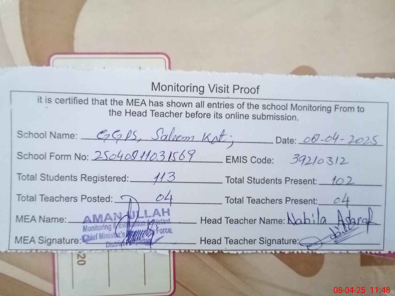 | EMIS Code: 39210312 | Name of School: GGPS SALEEM KOT | |||