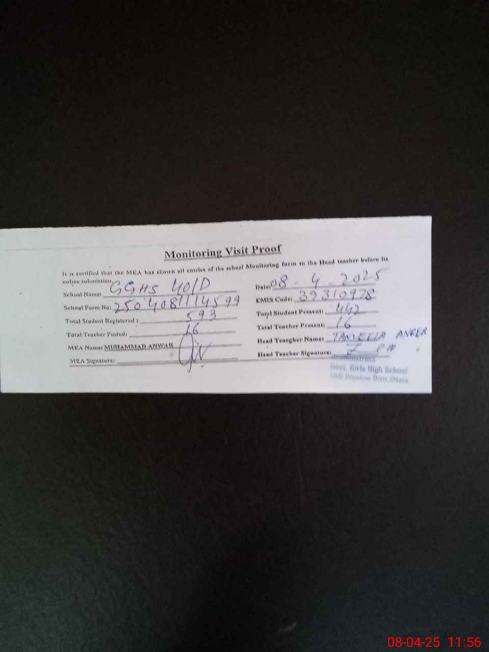 | Attendance Register | Head Teacher | MEA with School | Visit Proof |