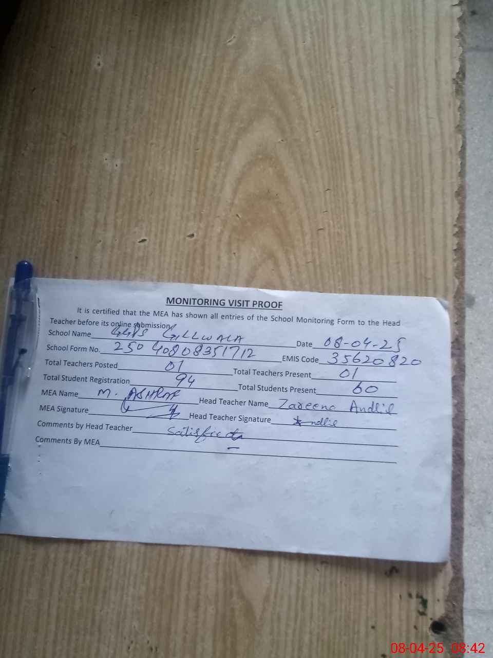 | Attendance Register | Head Teacher | MEA with School | Visit Proof |