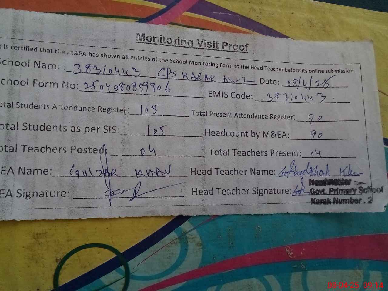 | Attendance Register | Head Teacher | MEA with School | Visit Proof |