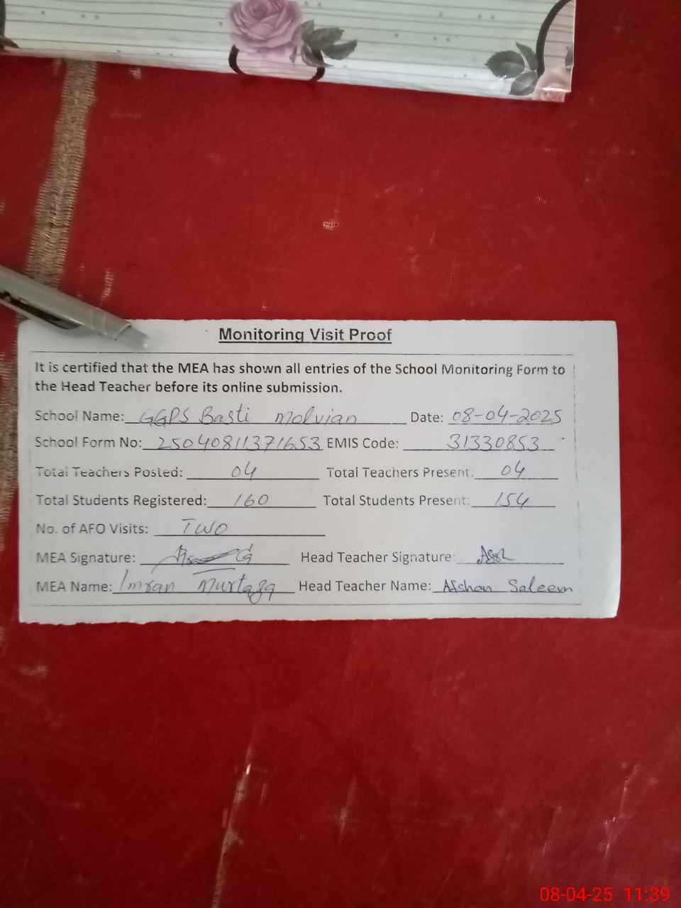 | Attendance Register | Head Teacher | MEA with School | Visit Proof |