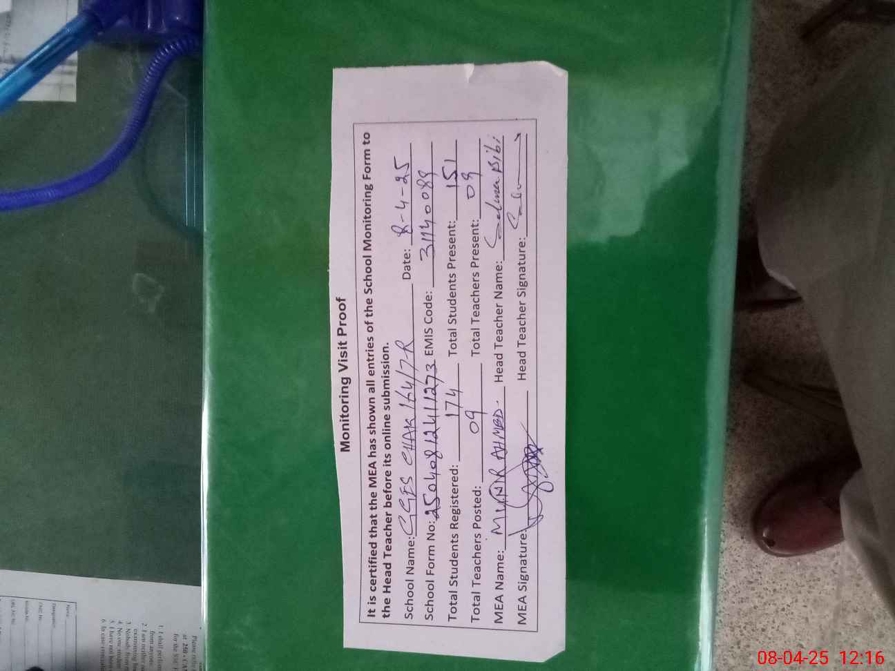 | Attendance Register | Head Teacher | MEA with School | Visit Proof |